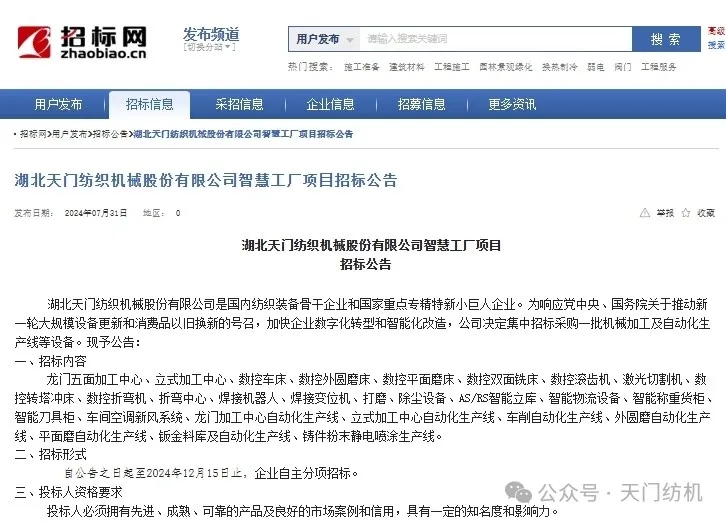 近日,天門紡機對外發(fā)布設備招標公告,正式啟動“智慧工廠”項目新一輪設備采購計劃。