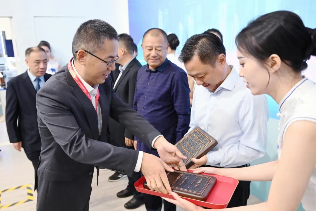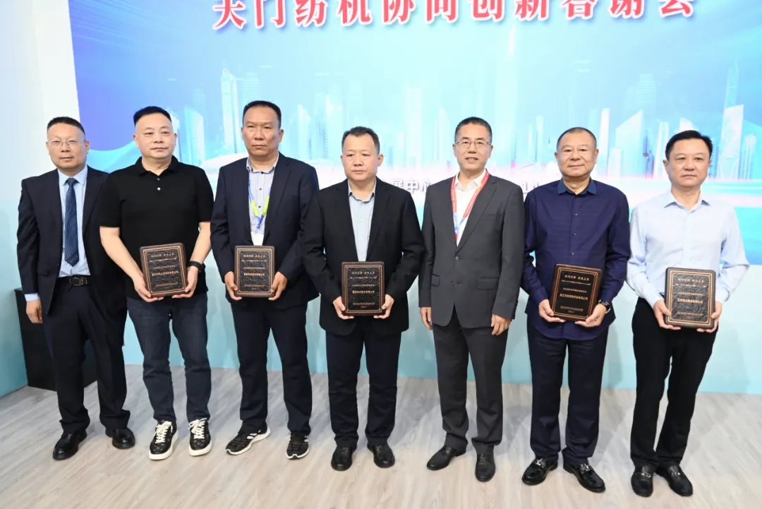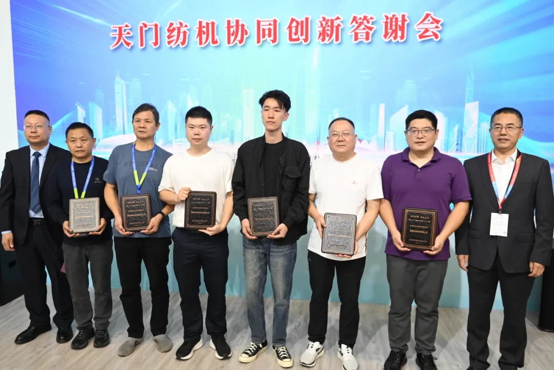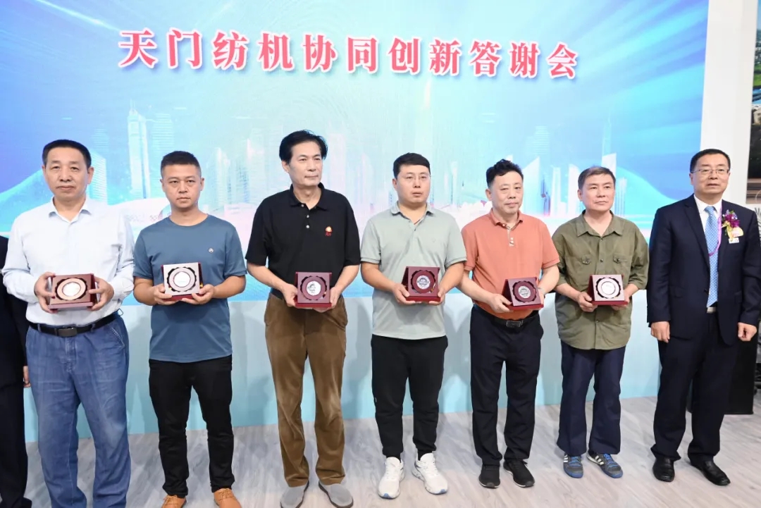 天門紡機總經(jīng)理焦倫進宣布在協(xié)同創(chuàng)新中作出突出貢獻的單位和個人名單,中國紡織工業(yè)聯(lián)合會徐迎新副會長為倪俊龍董事長、陳冰教授、曹中華博士、陸惠文先生頒發(fā)紀(jì)念章,為臺達、匯川、南通五洲等3家企業(yè)代表頒發(fā)紀(jì)念牌。